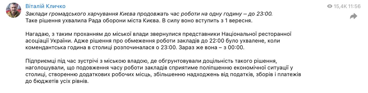 "Предприниматели во время встречи с городскими властями, где обосновывали целесообразность такого решения, отмечали, что продление времени работы заведений будет способствовать улучшению экономической ситуации в столице, созданию дополнительных рабочих мест, увеличению поступлений от налогов, сборов и платежей в бюджеты всех уровней", - написал Кличко.