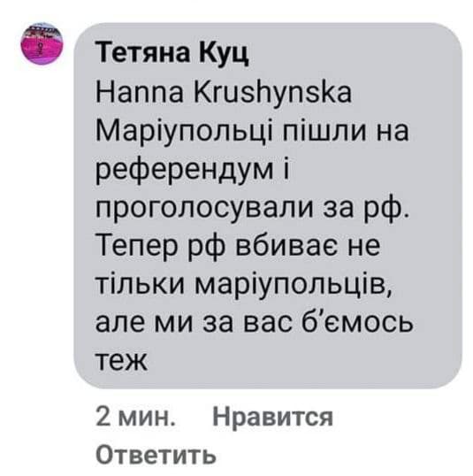 "Мариупольцы пошли на референдум (в мае 2014 года - Ред.) и проголосовали за РФ. Теперь РФ убивает не только мариупольцев, но мы за вас бьемся тоже", - заявила она в ответ на критику фильма.