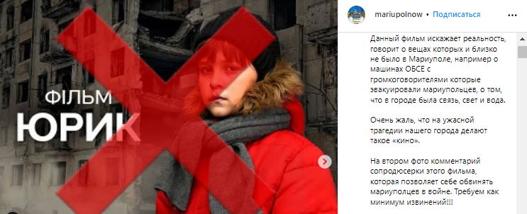 "Данный фильм искажает реальность, говорит о вещах которых и близко не было в Мариуполе, например о машинах ОБСЕ с громкоговорителями, которые эвакуировали мариупольцев. О том, что в городе была связь, свет и вода. Очень жаль, что на ужасной трагедии нашего города делают такое "кино", - комментирует паблик "Мариуполь сейчас".