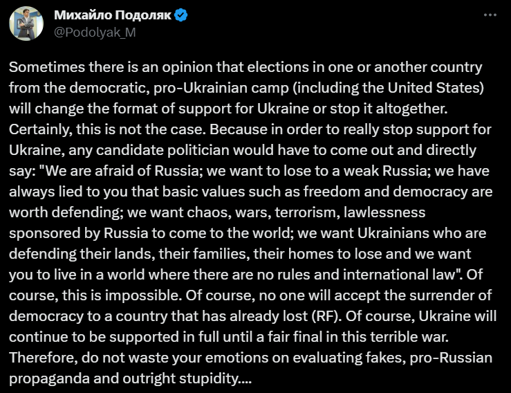 "Для того, чтобы действительно прекратить поддержку Украины, любой политик-кандидат должен был бы выйти и прямо сказать: "Мы боимся России; мы хотим проиграть слабой России; мы всегда лгали вам, что базовые ценности, такие как свободу и демократию стоит защищать; мы хотим, чтобы хаос, войны, терроризм, беззаконие, спонсируемые Россией, пришли в мир; мы хотим, чтобы украинцы, защищающие свою землю, свои семьи, свои дома, погибли, и мы хотим, чтобы вы жили в мире, где нет никаких правил и международного права"", - написал Подоляк.