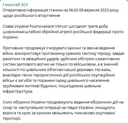 Опубликована оперативная информация по состоянию на утро 9 сентября 2023 года по поводу российского вторжения.