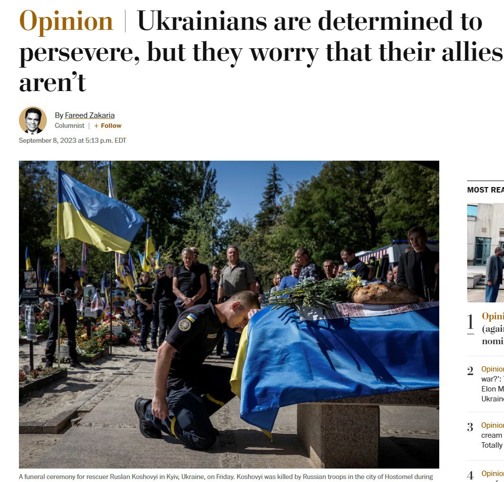 "Украинцы понимают, что их ждет долгая война на истощение. Они понимают, что столкнулись с грозным противником — население России почти в четыре раза превышает население Украины , а ее экономика примерно в 15 раз больше . Украинцы полны решимости продолжать борьбу, но они обеспокоены тем, что их союзники этого не делают", — пишет Захария.