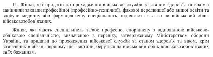 Согласно этим документам, женщины, пригодные к военной службе по возрасту (18-60) и закончившие профессиональные или профессионально-технические заведения, а также заведения высшего образования и получившие медицинскую или фармацевтическую специальность, подлежат взятию на военный учет.