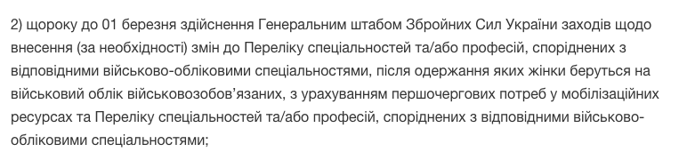 Но есть нюанс. В приказе Минобороны говорится, что: "ежегодно до 1 марта Генеральным штабом Вооруженных сил Украины осуществляются меры относительно внесения (при необходимости) изменений к перечню специальностей в Перечень..., после получения которых женщины берутся на военный учет, в связи с первоочередными нуждами в мобилизационных ресурсах.