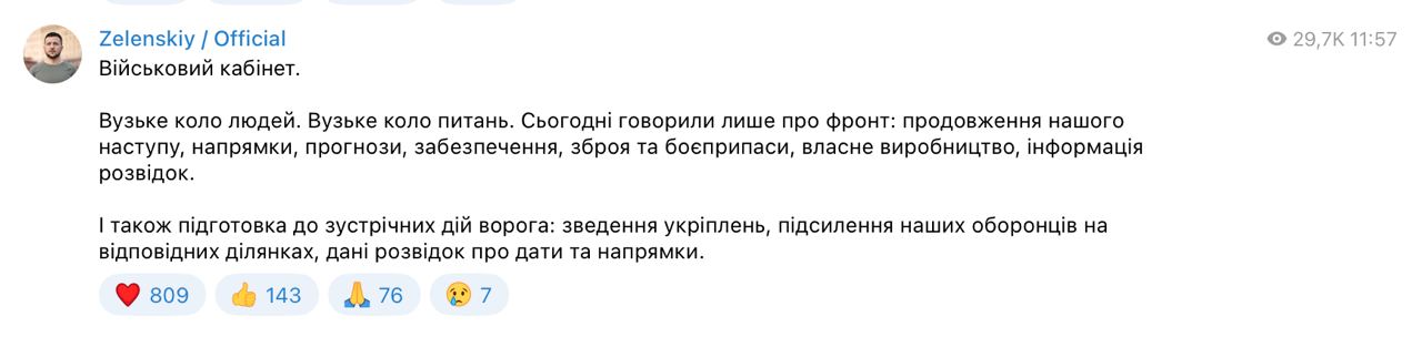 "Сегодня говорили только о фронте: продолжение нашего наступления, направления, прогнозы, снабжение, оружие и боеприпасы, собственное производство, информация разведок. И также подготовка к встречным действиям врага: возведение укреплений, усиление наших защитников на соответствующих участках, данные разведок о датах и направлениях", - сообщил президент.