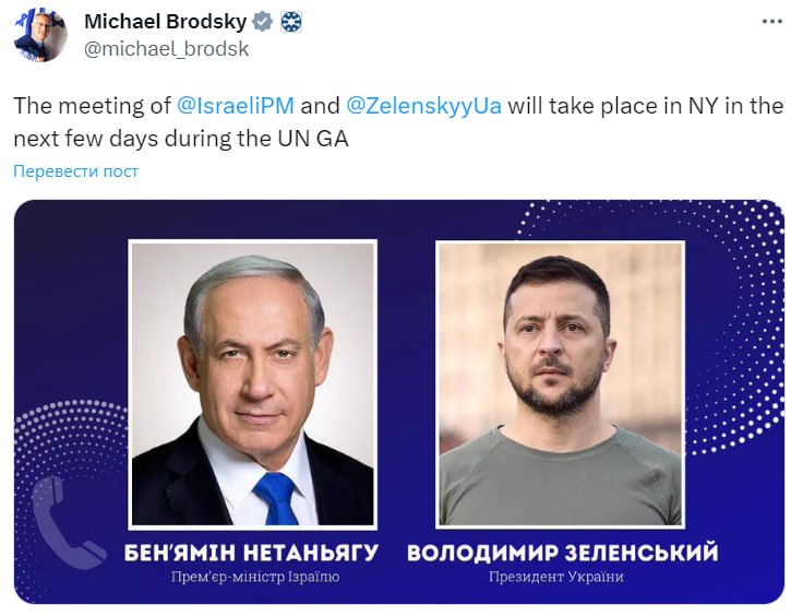 "Встреча премьер-министра Израиля и Зеленского состоится в Нью-Йорке в ближайшие несколько дней во время Генассамблеи ООН", - сказано в посте.