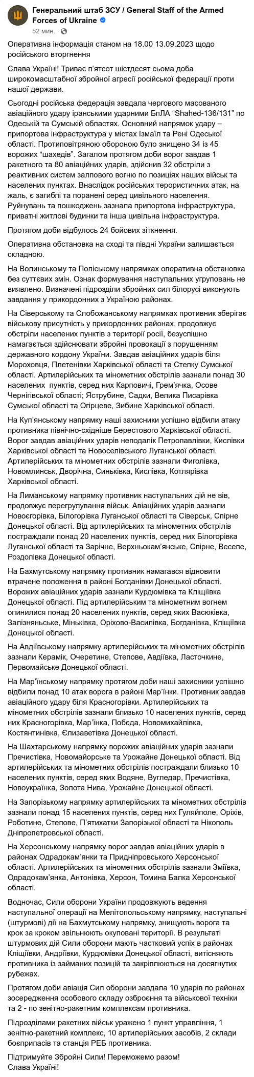 Генштаб ВСУ опубликовал оперативную информацию о российском вторжении по состоянию на 18:00 13 сентября.