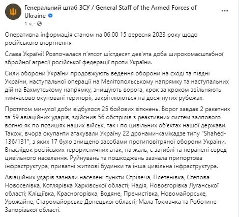 Генштаб ВСУ обнародовал сводку о ситуации на фронте на утро 15 сентября.