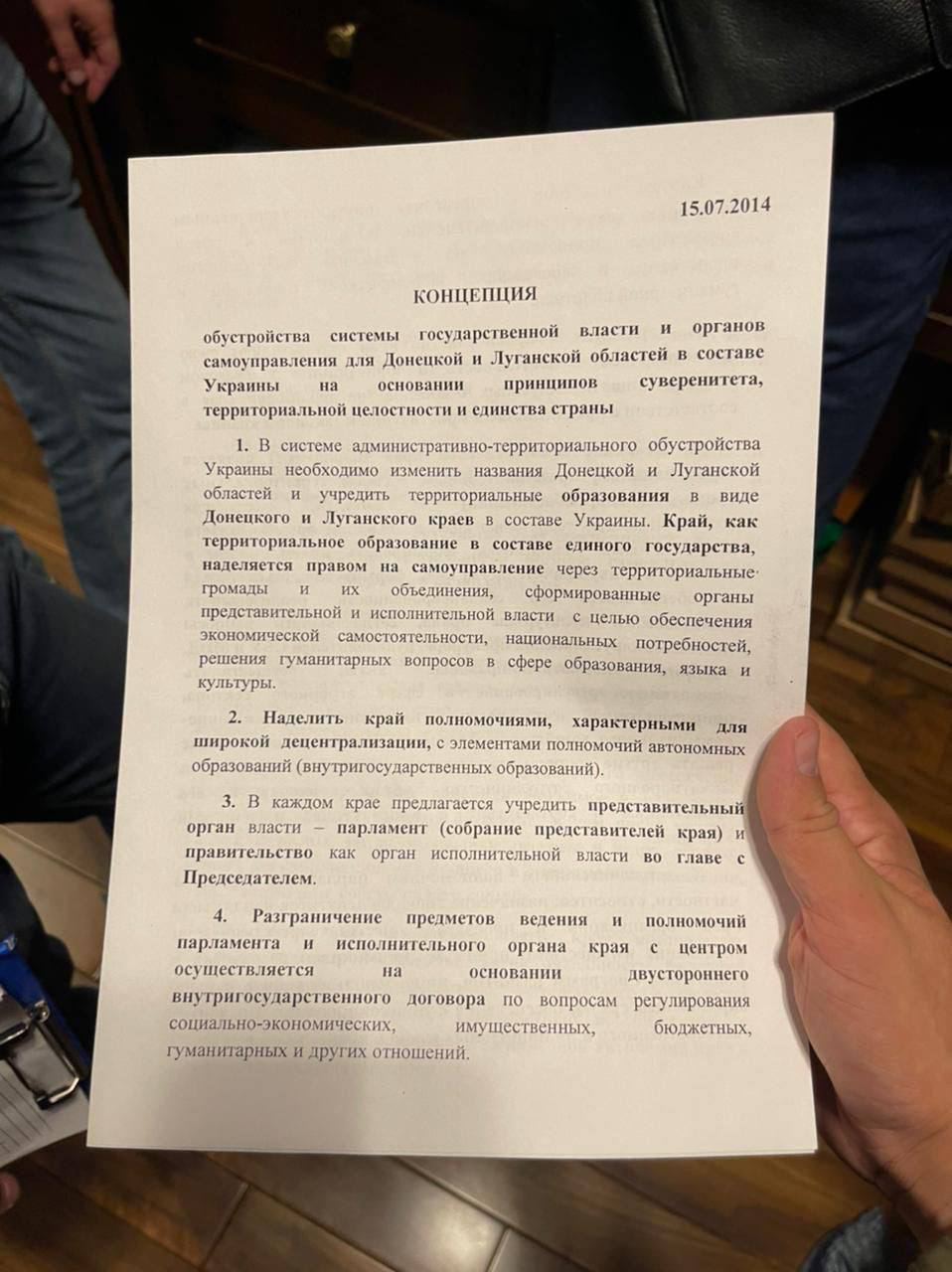 Телеграм-каналы публикуют проект предоставления Донбассу автономии, датированный июлем 2014 года, за подписью Медведчука и Шуфрича, который, как утверждается, нашла СБУ во время обыска у Шуфрича.