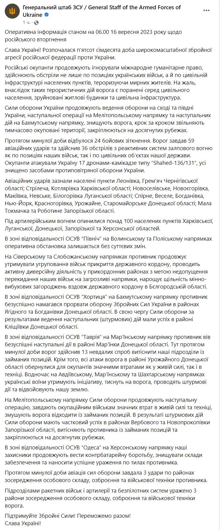 Война в Украине идет уже 570-й день. Мы следим за последними новостями и ключевыми событиями 16 сентября 2023 года в онлайне.