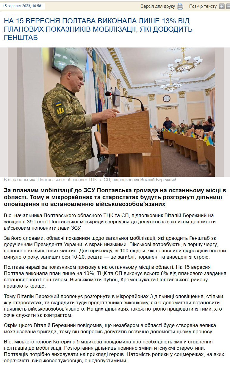 По его словам, Полтава по показателю призыва находится на последнем месте в области - она выполнила план Генштаба всего на 13%.
