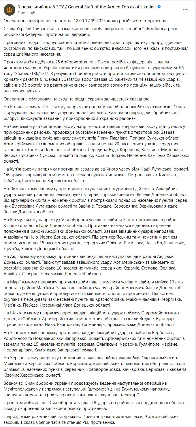 В воскресенье, 17 сентября, в Украине идет 571-й день войны с Россией.