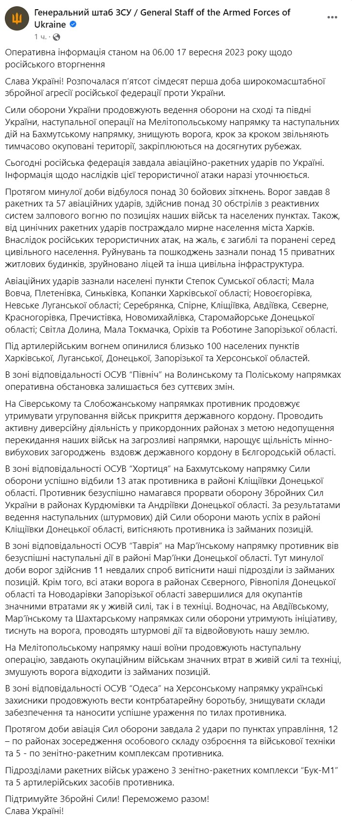 За прошедшие сутки произошло более 30 боевых столкновений. РФ нанесла 8 ракетных и 57 авиационных ударов, совершила более 30 обстрелов из реактивных систем залпового огня по позициям наших войск и населенным пунктам.