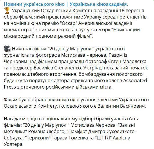 Украинский документальный фильм "20 дней в Мариуполе" Мстислава Чернова будет представлять Украину на Оскаре в номинации "Лучший международный полнометражный фильм".