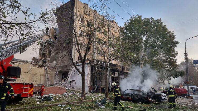 В МВД заявляют, что это следствие падения обломков ракеты. На фото и видео заметно, что разрушения в здании очень серьезные.