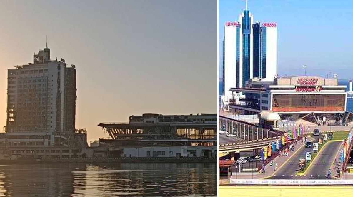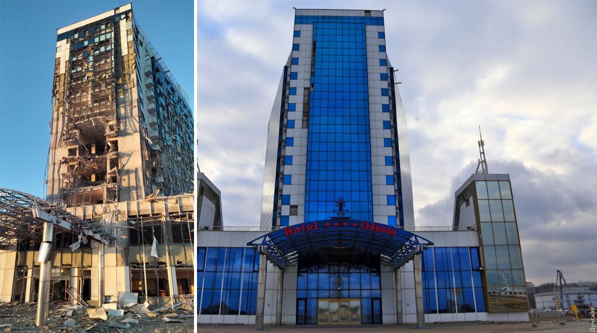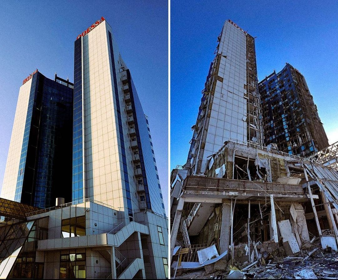В сети публикуют фото отеля "Одесса" до и после ночного удара РФ и пожара.