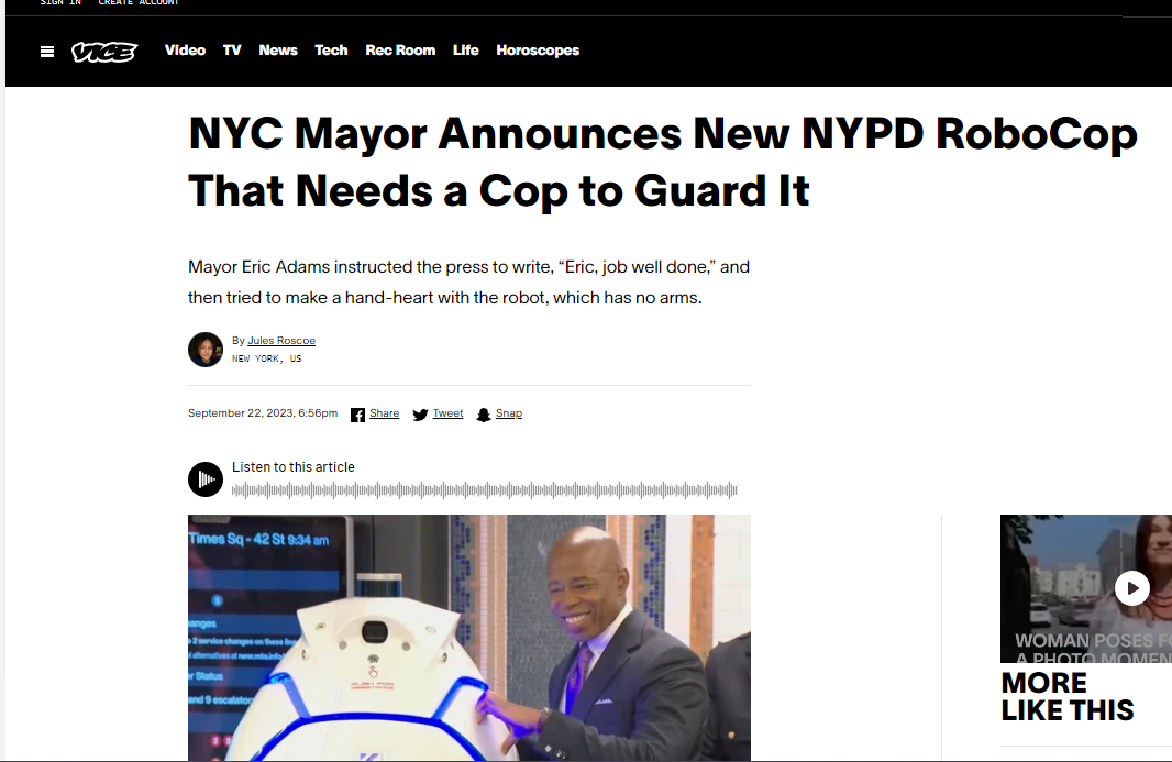 В Нью-Йорке на борьбу с преступностью выходит робокоп. Оружия ему пока не дают, но есть кнопка экстренного вызова и функция видеозаписи.