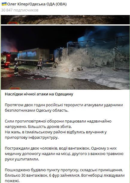 В Измаильском районе произошло попадание в припортовую инфраструктуру. Пострадали двое мужчин, водители грузовиков. Одному из них медицинскую помощь оказали на месте, второму с тяжелой травмой руки госпитализировали.