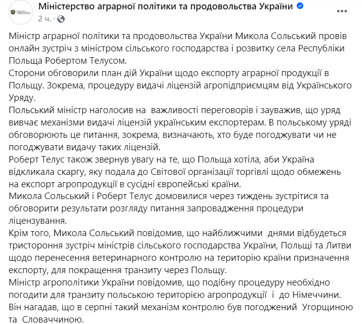 Министры сельского хозяйства Украины и Польши провели разговор касательно экспорта зерна.