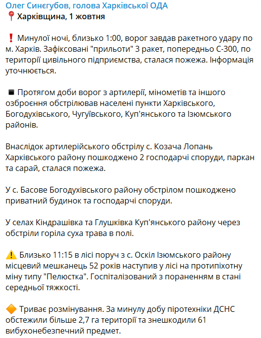 "Прошлой ночью, около 1:00, враг нанес ракетный удар по Харькову. Зафиксированы "прилеты" 3 ракет, предварительно С-300, по территории гражданского предприятия, произошел пожар", - написал Синегубов.