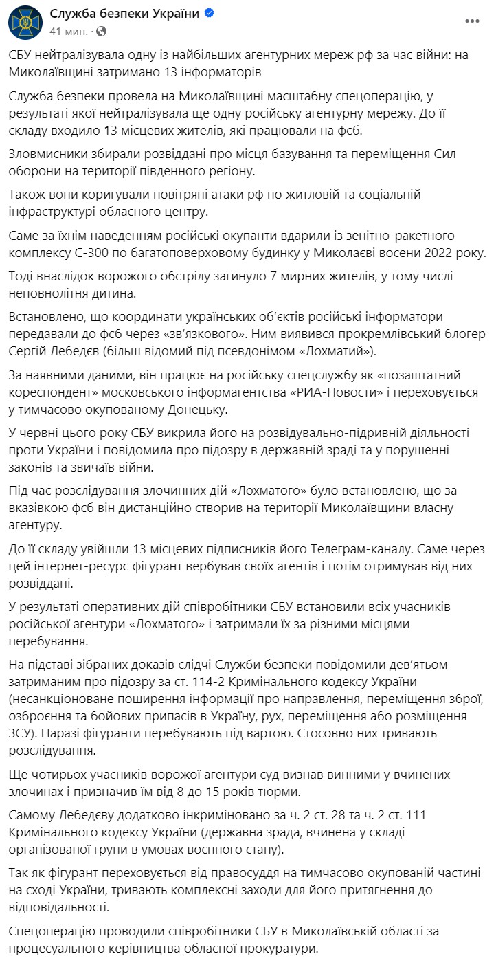 Служба безопасности Украины сообщила, что нейтрализовала одну из крупнейших агентурных сетей РФ за время войны. Задержаны 13 информаторов.