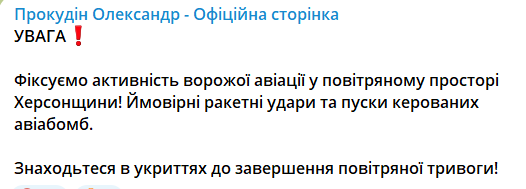 "Фиксируем активность вражеской авиации в воздушном пространстве Херсона! Вероятны ракетные удары и пуски управляемых авиабомб", - написал Прокудин.