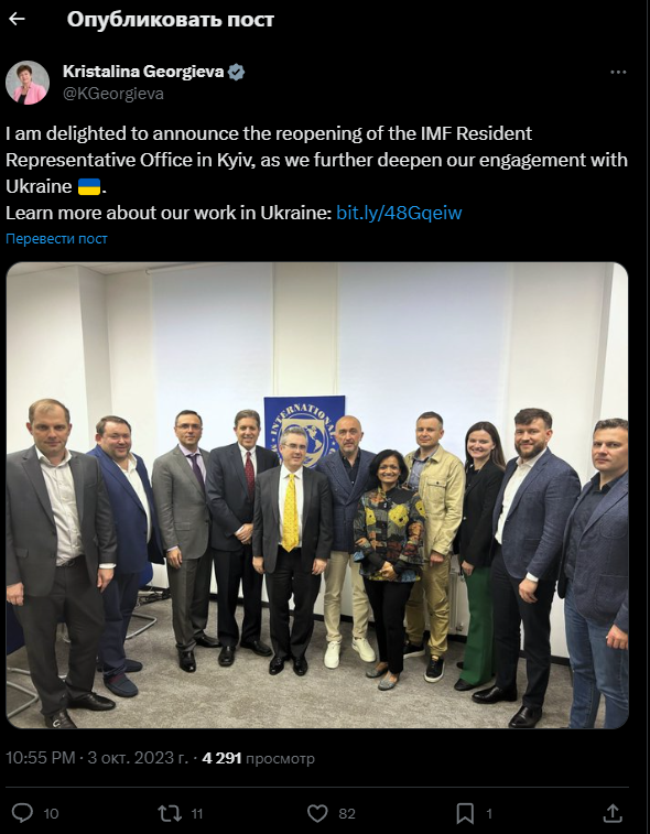 "Я рада объявить об открытии вновь постоянного представительства МВФ в Киеве, поскольку мы еще больше углубляем наше взаимодействие с Украиной", – написала она в соцсети Х в ночь на среду.