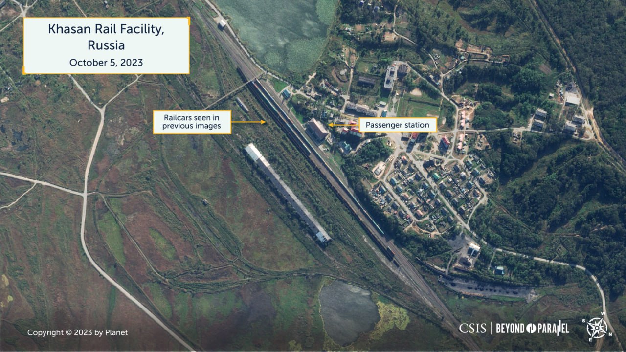 Спутниковые снимки железнодорожного пункта Туманган на границе КНДР с РФ показывают "беспрецедентное количество" грузовых вагонов за 5 октября - около 73 вагонов.