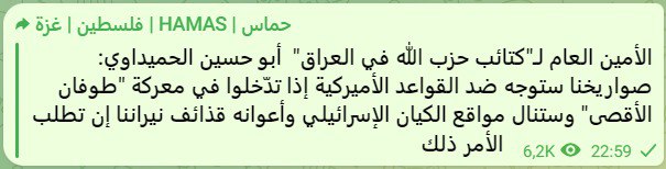 Об этом заявил генеральный секретарь бригад "Хезболла" в Ираке Абу Хусейн Аль-Хамидави. Данное сообщение было опубликовано в телеграм-канале ХАМАС.