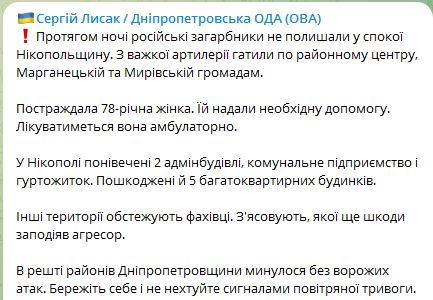 Ночью, 11 октября, силы РФ из тяжелой артиллерии обстреляли Никопольский район Днепропетровской области. Били по Никополю, Марганецкой и Мировской громадам.