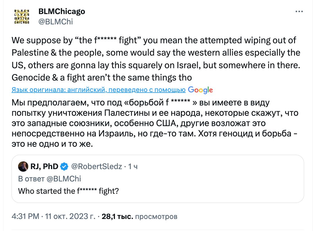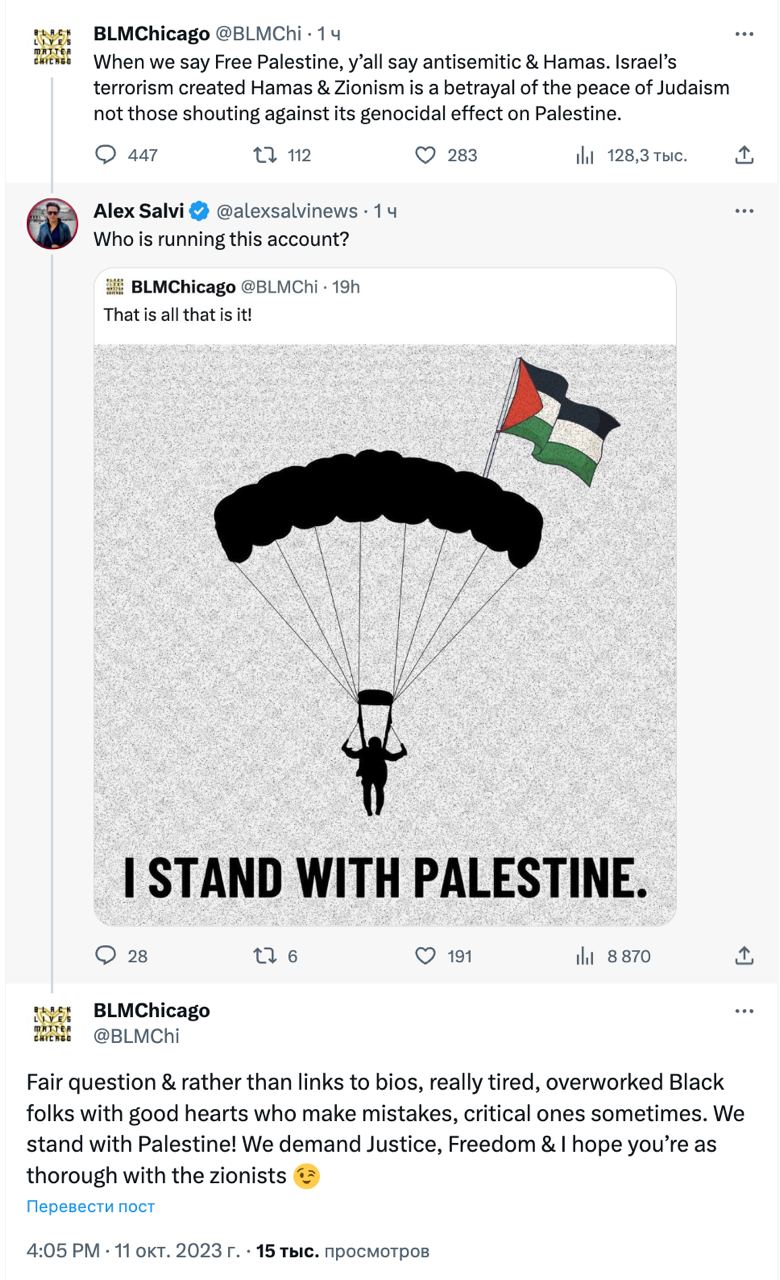 Сначала активисты BLM запостили в Х картинку с диверсантом ХАМАС на параплане и подписью: "Я поддерживаю Палестину". Затем ее удалили, а пользователи задали вопрос, кто ведет этот аккаунт. В BLM ответили, что иногда "допускают ошибки", но Палестину все-таки поддерживают.