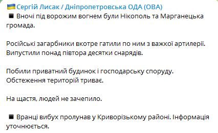 07.35 Ночью россияне из тяжелой артиллерии обстреляли и Никополь Марганецкую громаду. Поврежден частный дом. Погибших нет.