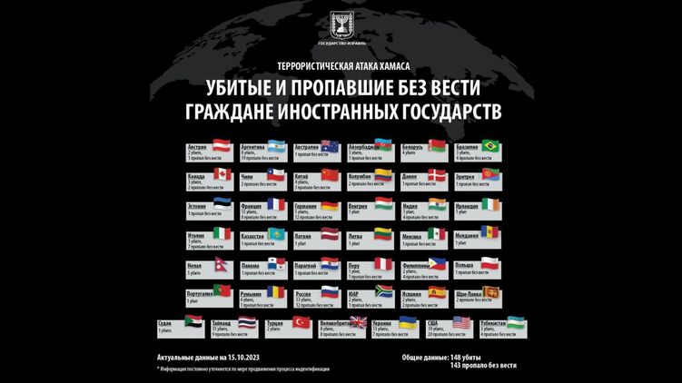 К настоящему моменту известно о гражданах 43 государств. Количество погибших украинцев, по информации израильской стороны, составляет 13 человек, хотя в МИД Украины сообщали о двенадцати погибших.