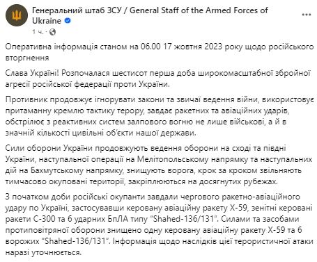 Утром 17 октября Генштаб ВСУ обнародовал сводку о ситуации на фронте.