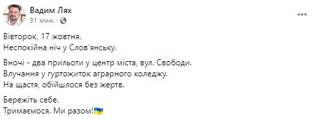 Ночью 17 октября в Славянске Донецкой области под удар попало общежитие аграрного колледжа.