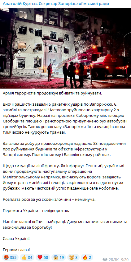 Сегодня мы уже сообщали, что ночью РФ нанесла ракетный удар по Запорожью. Есть попадание в жилой дом.