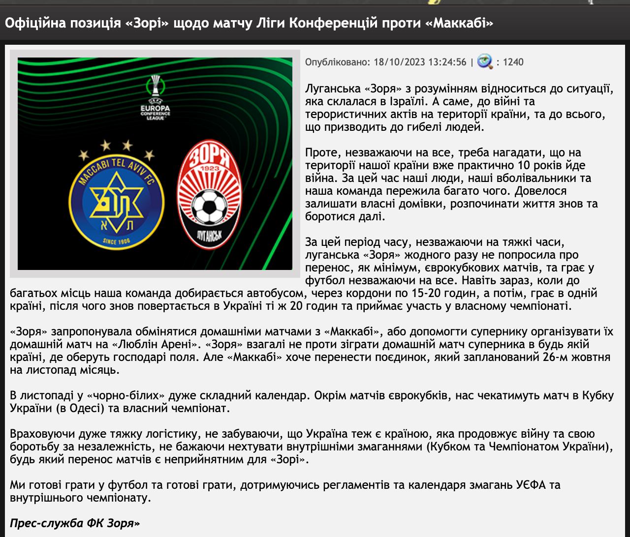 Луганская "Заря" осудила решение УЕФА о переносе матча Лиги конференций с "Маккаби" из Тель-Авива
