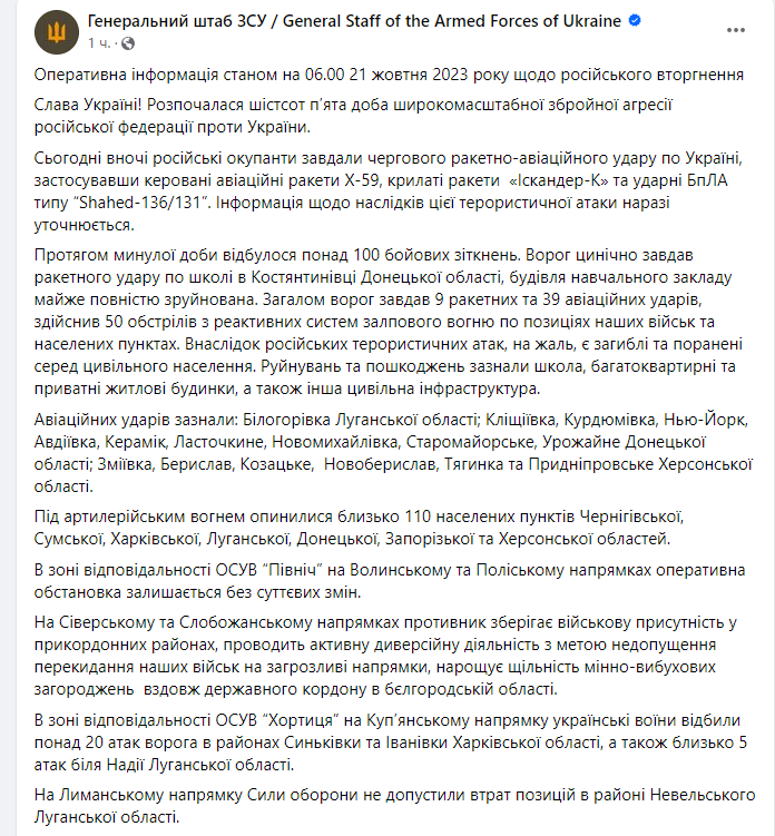 Война в Украине идет уже 605-й день. Мы следим за последними новостями и ключевыми событиями 21 октября 2023 года в обновляемом онлайне.
