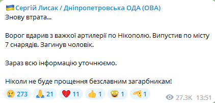 "Враг ударил из тяжелой артиллерии по Никополю. Выпустил по городу 7 снарядов. Погиб мужчина", - написал он.