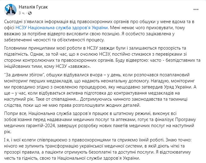 Сама Гусак заявила, что постоянные проверки ее службы "безосновательны и инициированы теми, кому НСЗУ мешает".