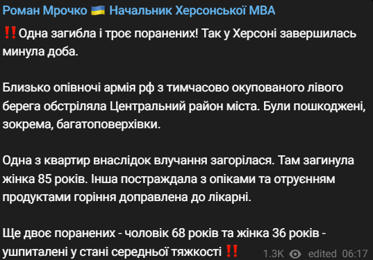 "Около полуночи армия России с временно оккупированного левого берега обстреляла Центральный район города. Были повреждены, в частности многоэтажки", - написал он.