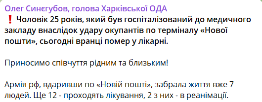 "Мужчина 25 лет, который был госпитализирован в медицинское учреждение в результате удара оккупантов по терминалу "Новой почты", сегодня утром скончался в больнице", - напиал он.