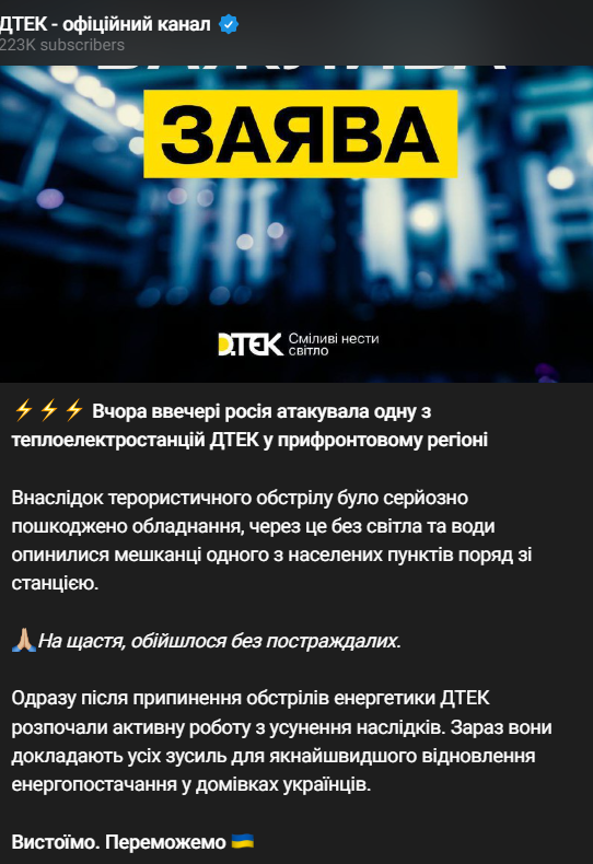 В ДТЭК сообщили, что Россия атаковала одну из теплоэлектростанций ДТЭК в прифронтовом регионе.