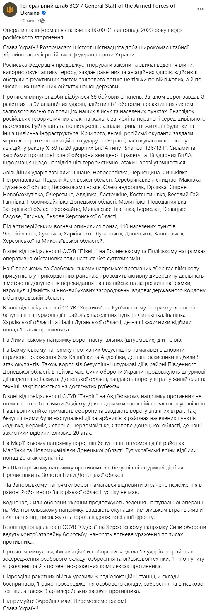 За прошедшие сутки произошло 68 боевых столкновений. Всего РФ нанесла 8 ракетных и 97 авиационных ударов, совершила 84 обстрела из реактивных систем залпового огня по позициям наших войск и населенным пунктам.