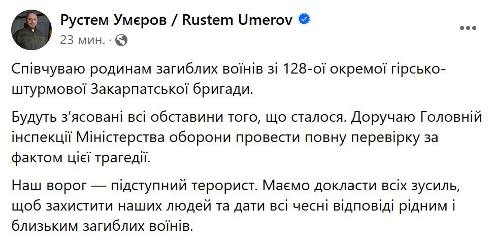 23:23 Умеров поручил провести проверку гибели военных 128-й отдельной горно-штурмовой Закарпатской бригады, которые погибли от удара "Искандера" в Запорожской области.