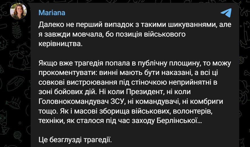 "Если трагедия уже попала в публичную плоскость, то могу прокомментировать: виновные должны быть наказаны, а все эти совковые выстраивания под стеночкой неприемлемы в зоне боевых действий. Ни когда Президент, ни когда Главнокомандующий ВСУ, ни командующие, ни комбриги и т.д. Как и массовые сборища военных, волонтеров, техники, как произошло во время мероприятия Берлинской (имеется в виду удар по Драмтеатру в Чернигове в августе - Ред.)", - написала Безуглая.