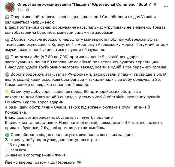 За сутки россияне сбросили более 50 управляемых авиабомб по правому берегу Херсонской области. Разрушено учебное заведение. Обстановка остается напряжений.