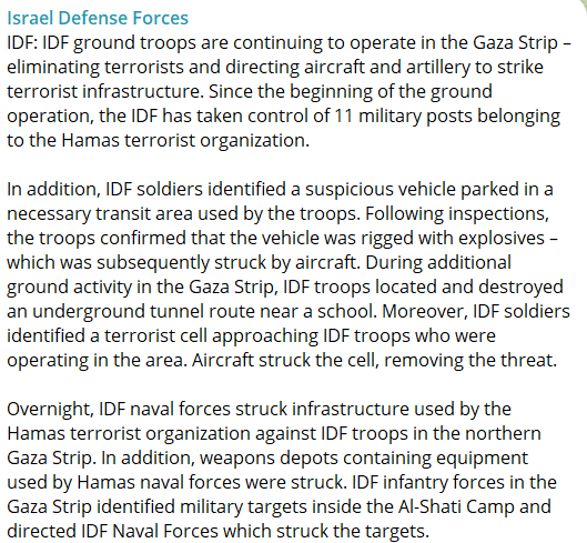 14:30 Армия обороны Израиля с начала наземной операции взяла под контроль 11 военных постов, принадлежащих ХАМАС.