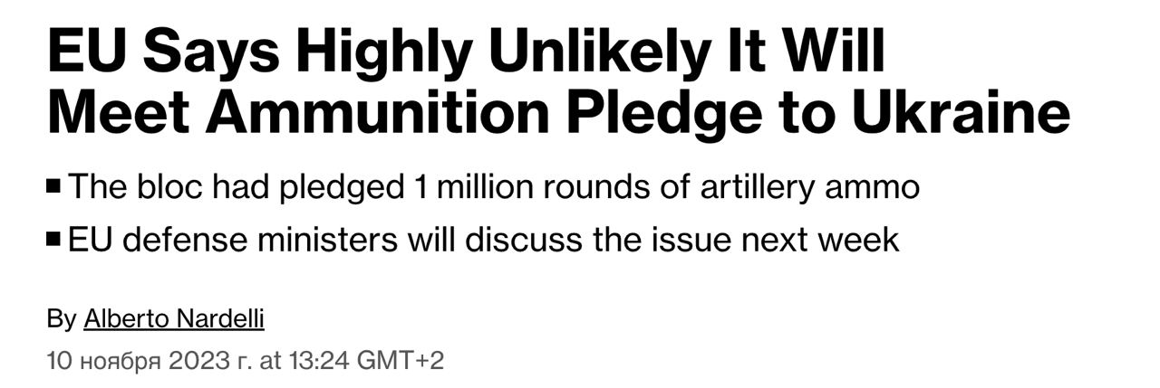 ЕС заявил, что вряд ли выполнит свое обещание по поставкам Украине миллиона боеприпасов к марту 2024 года.