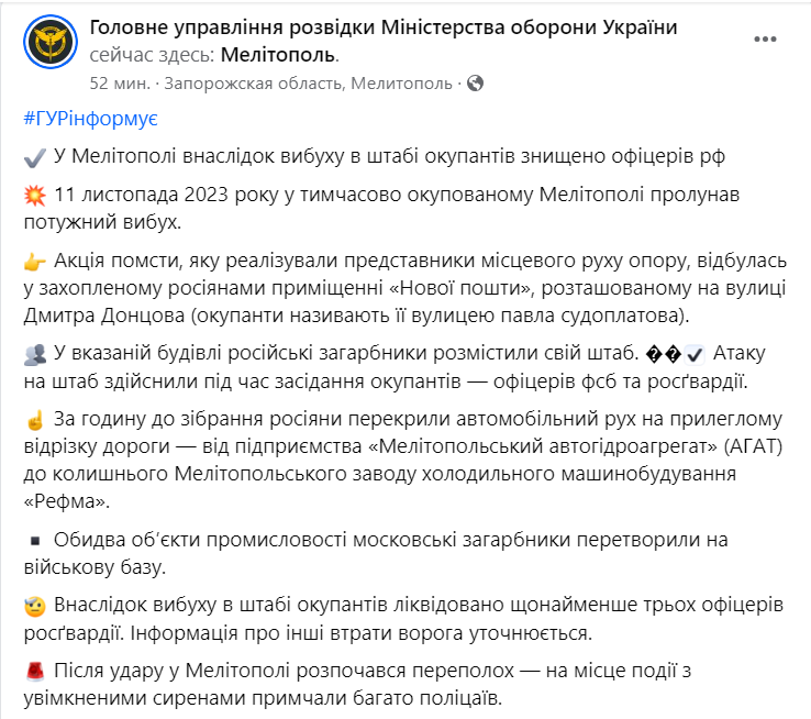 В Мелитополе подорвали российский штаб, ликвидированы три офицера РФ - ГУР